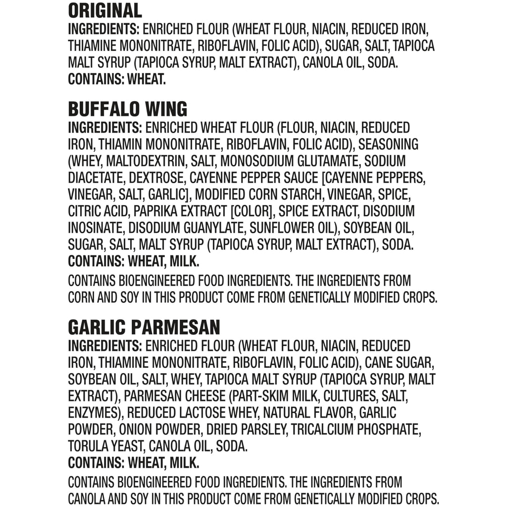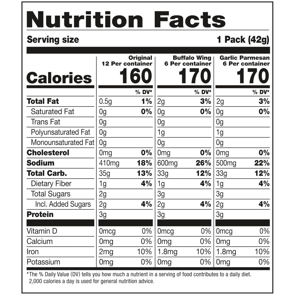 - PRETZEL VARIETY PACK: A selection of our most popular flavors: Original (12), Buffalo Wing (6), Garlic Parmesan (6)